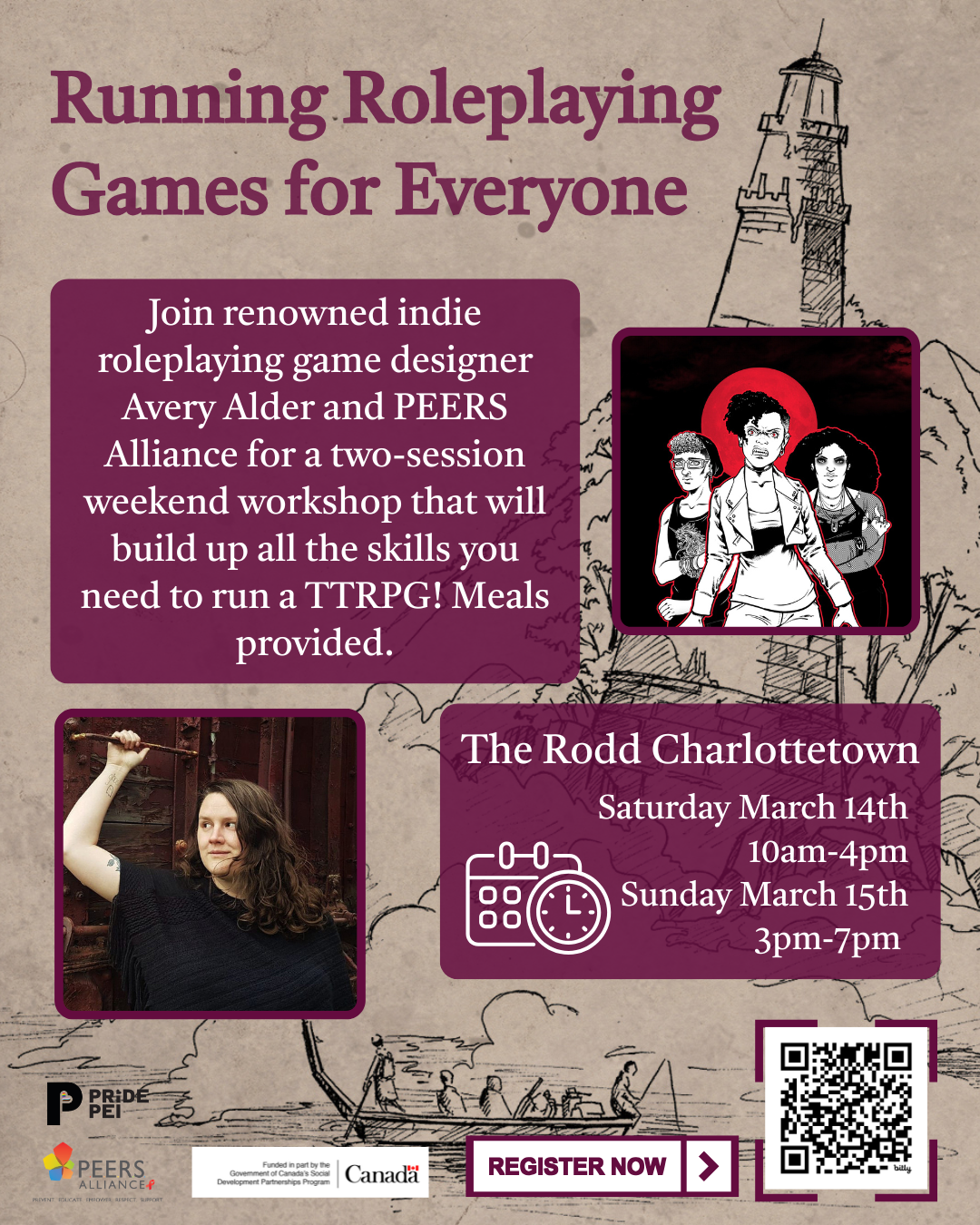 Tabletop roleplaying games bring people together to imagine weird new worlds, to creatively problem-solve, to laugh, and to build community. Want to learn how to run your own? Join renowned indie roleplaying game designer Avery Alder and PEERS Alliance for a two-session weekend workshop that will build up all the skills you need: hosting small groups, teaching new mechanics, running interesting and dynamic games, introducing safety mechanics, catering to access needs, and getting the most out of your prep time. After a Saturday of skill-building, you'll return on Sunday to put those skills into practice by running a short game.